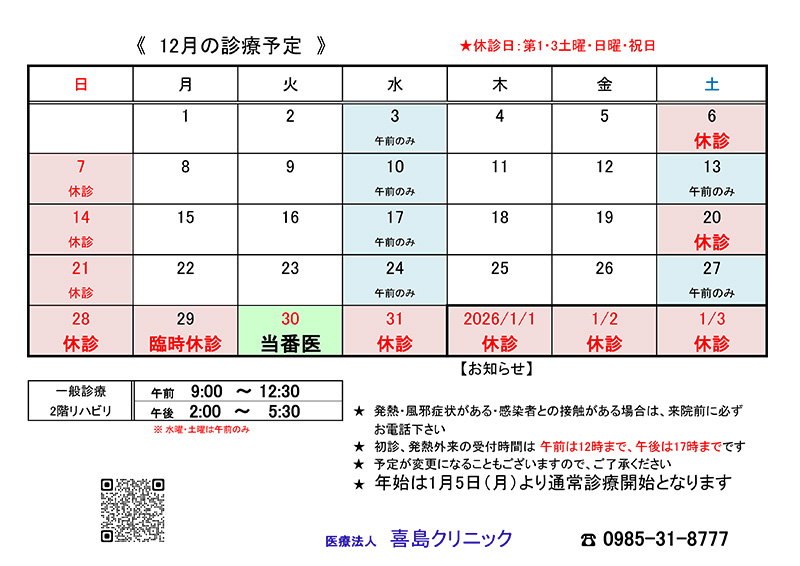 【診療時間】 午前 9:00~13:00(受付…12:30まで)